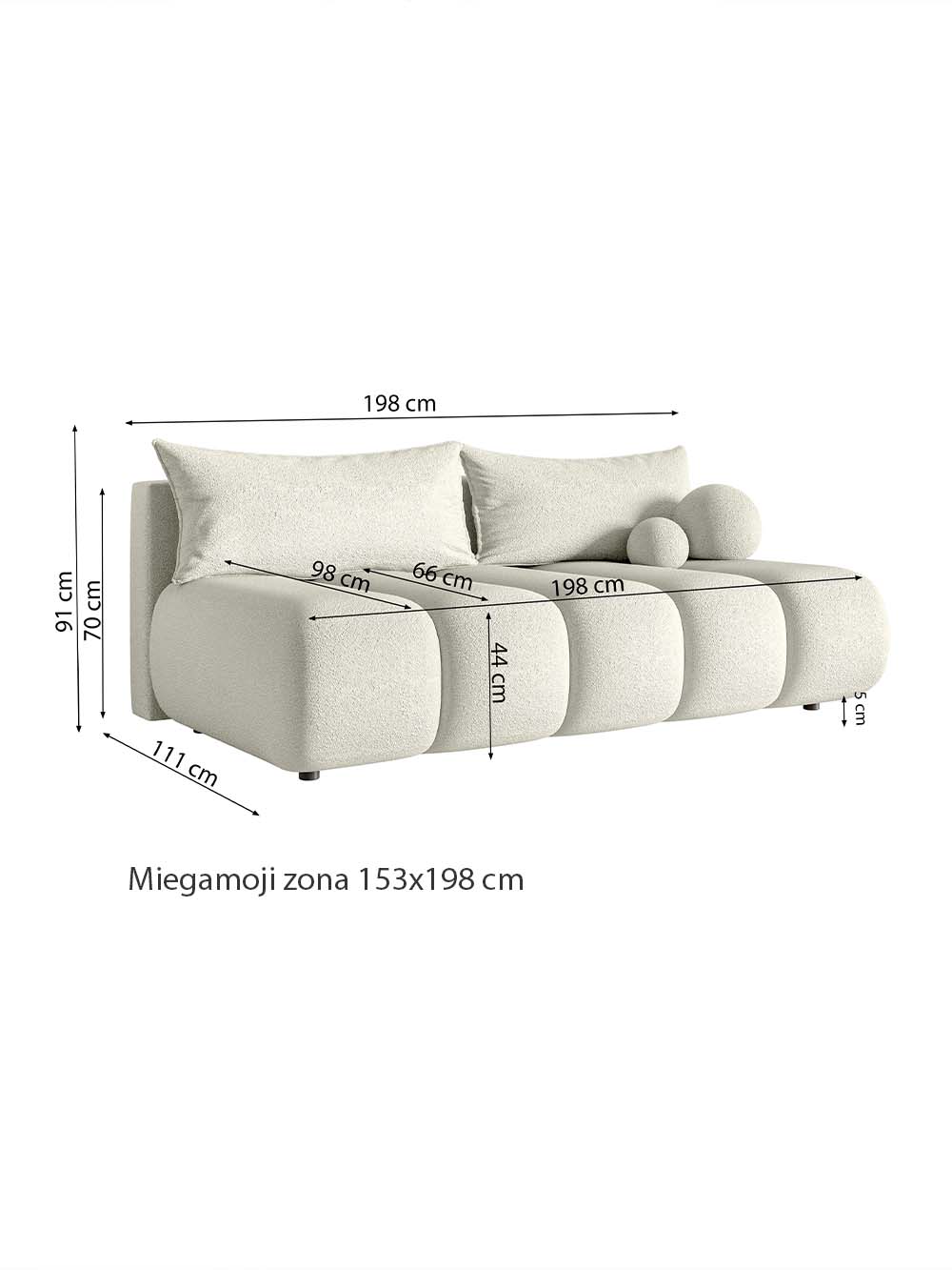 Miegojimo dalies matmenys: plotis / ilgis: 153 / 198 cm.