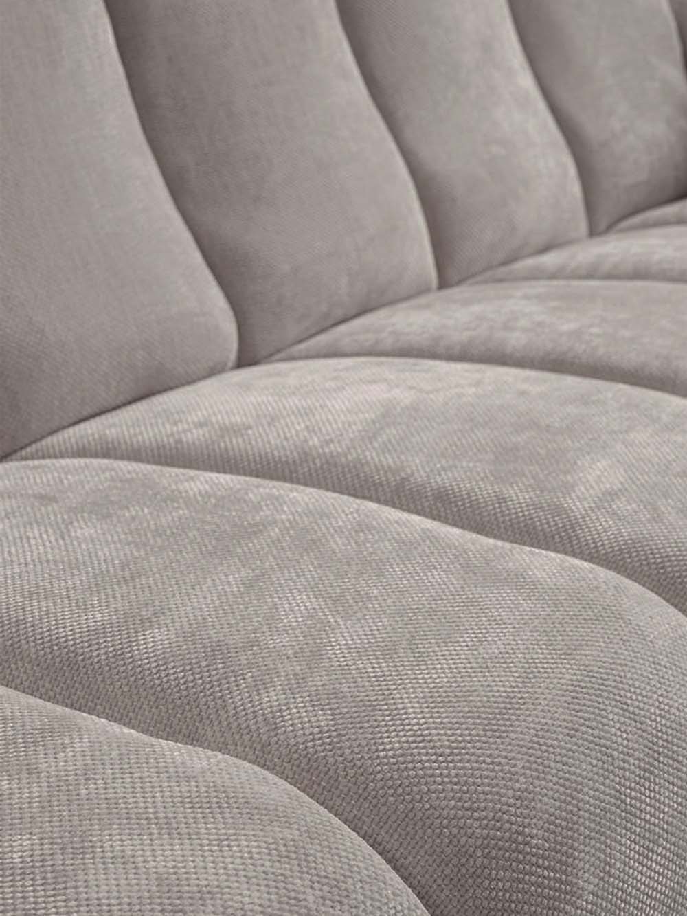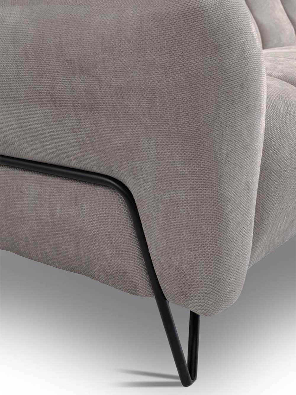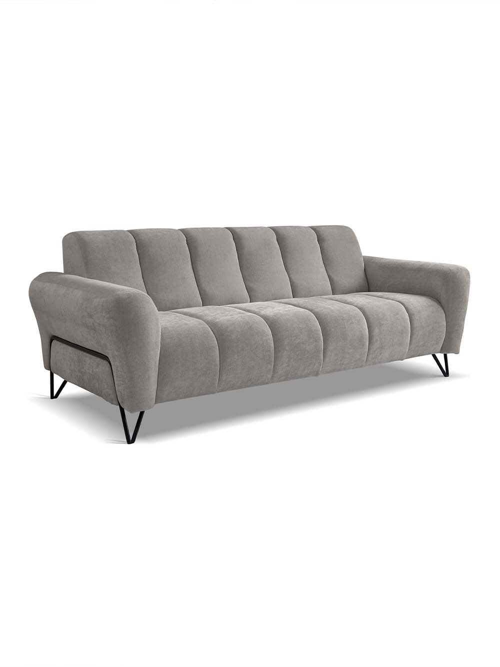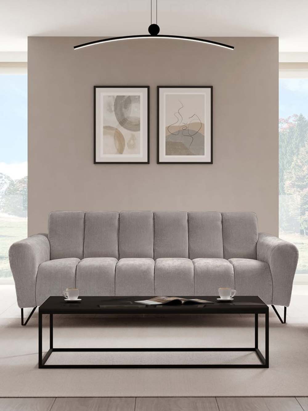 Trivietė sofa Velore – modernios estetikos baldas su minkštomis, apvalintomis formomis ir subtiliai išraiškingu siluetu. Pilko smėlio spalvos šenilinis audinys interjerui suteikia subtilaus jaukumo ir harmonijos, o juodos spalvos metalinis kojų rėmas pabrėžia šiuolaikišką charakterį. Platus atlošas ir erdvi sėdimoji dalis užtikrina išskirtinį komfortą – puikiai tinka kasdieniam poilsiui, jaukiems vakarams ar ramioms akimirkoms namuose.
