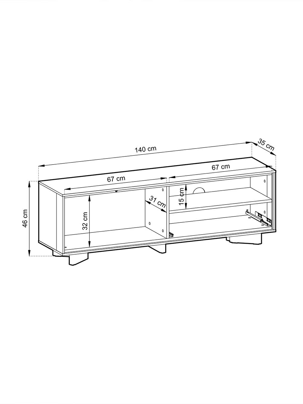 Išoriniai baldo matmenys CM: plotis / gylis / aukštis, 140 / 35 / 46.