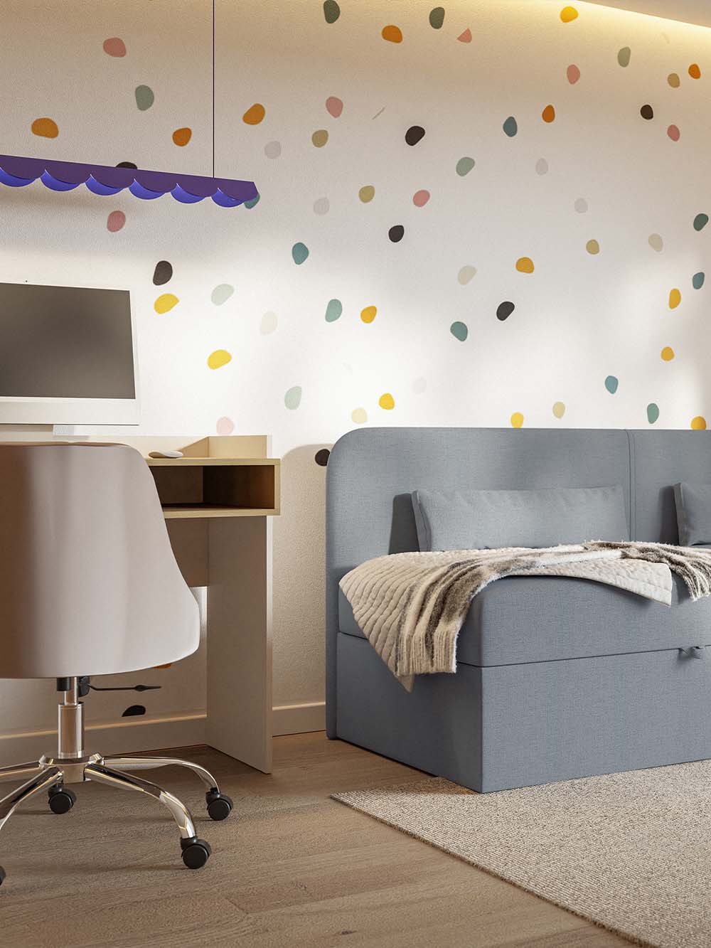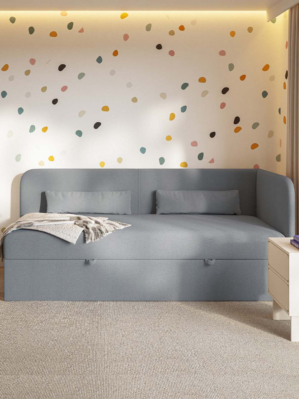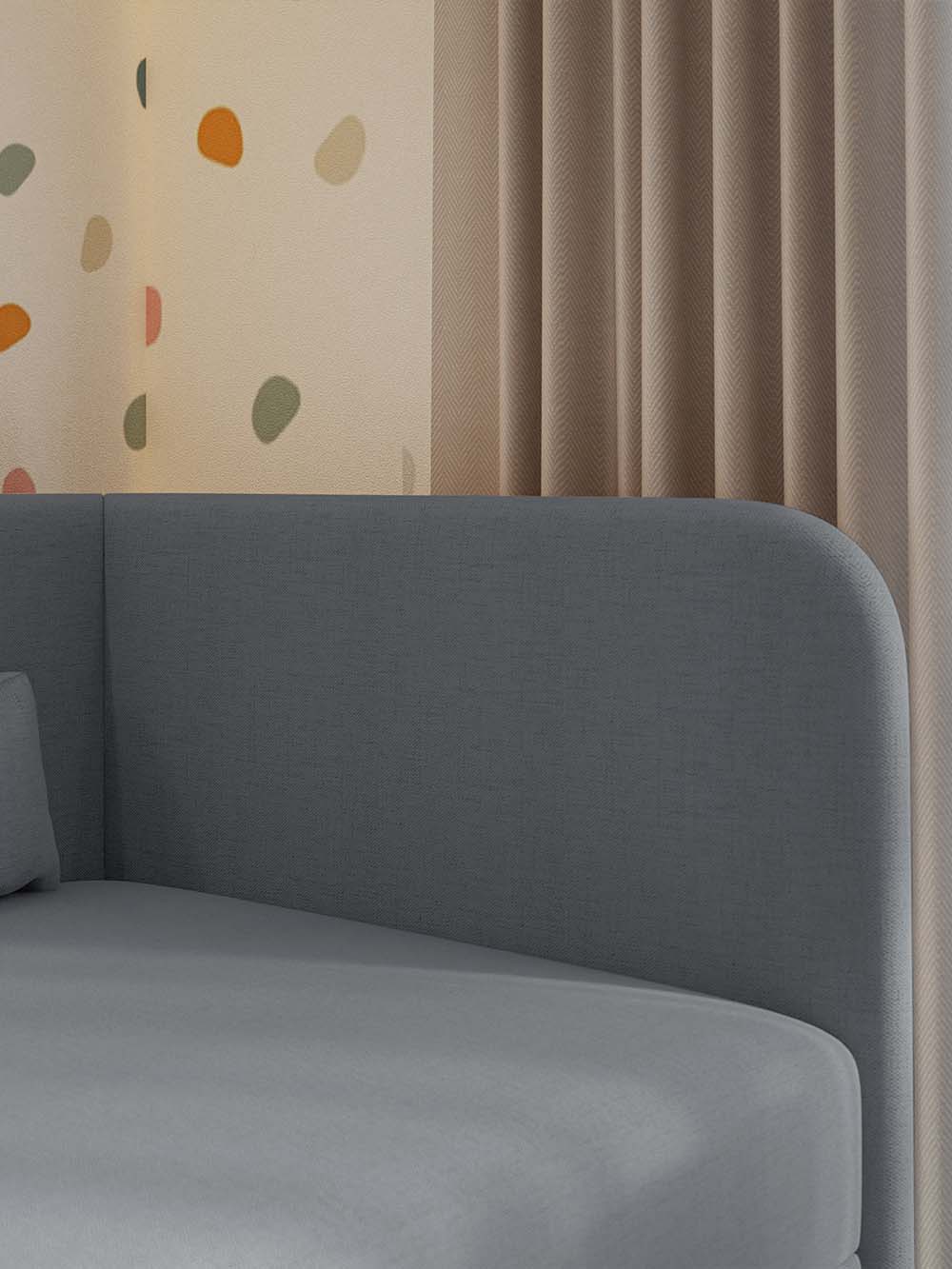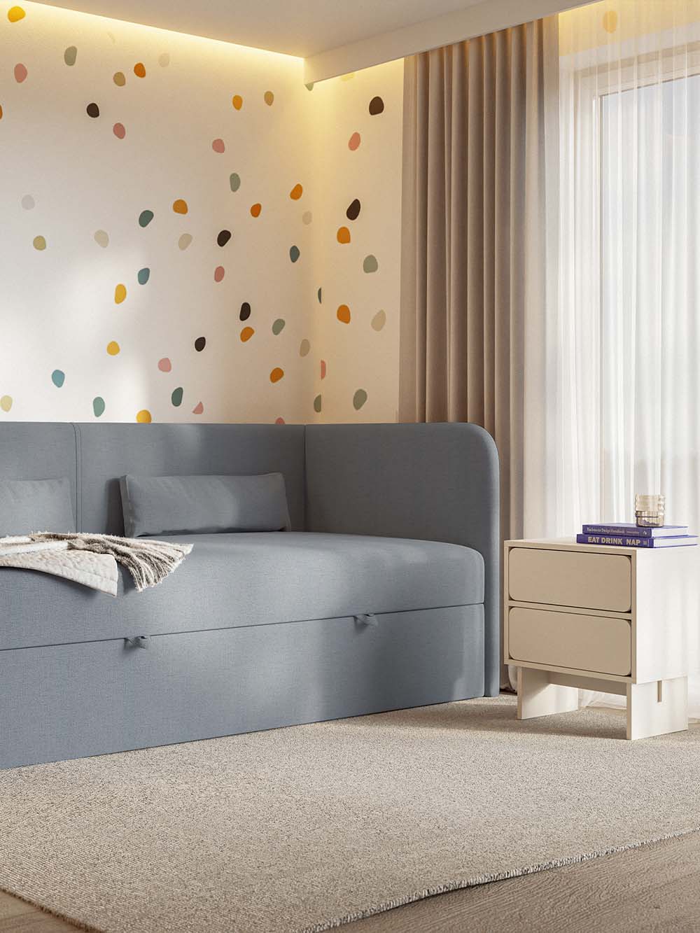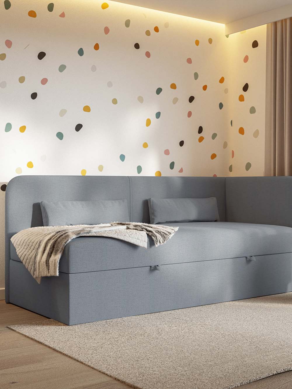 Vaikiška lova Nemo – tai modernaus ir funkcionalaus dizaino baldas, sukurtas patogiam kasdieniam vaikų ir paauglių poilsiui bei miegui. Lova aptraukta šeniliniu audiniu su hidrofobine danga, kuris yra švelnus, atsparus dėvėjimuisi ir lengvai valomas. Minkštas kampinis galvūgalis kartu su dviem komplekte esančiomis dekoratyvinėmis pagalvėmis suteikia patogią atramą ilsintis, skaitant ar ruošiant namų darbus, o integruota patalynės dėžė padeda palaikyti tvarką kambaryje.