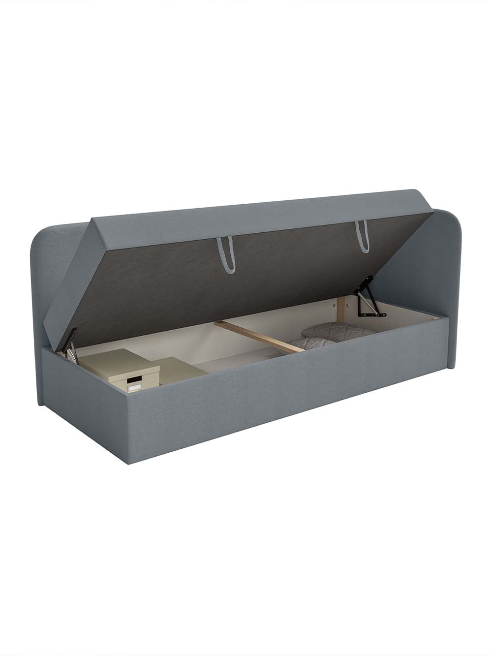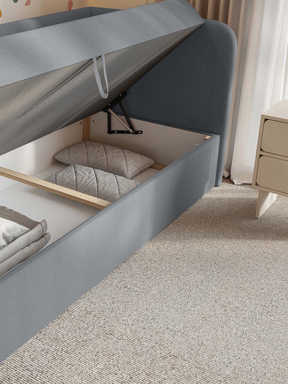 Patalynės dėžė: Yra. Atidaroma iš šono. Pakėlimo mechanizmo tipas - spyruoklinis.