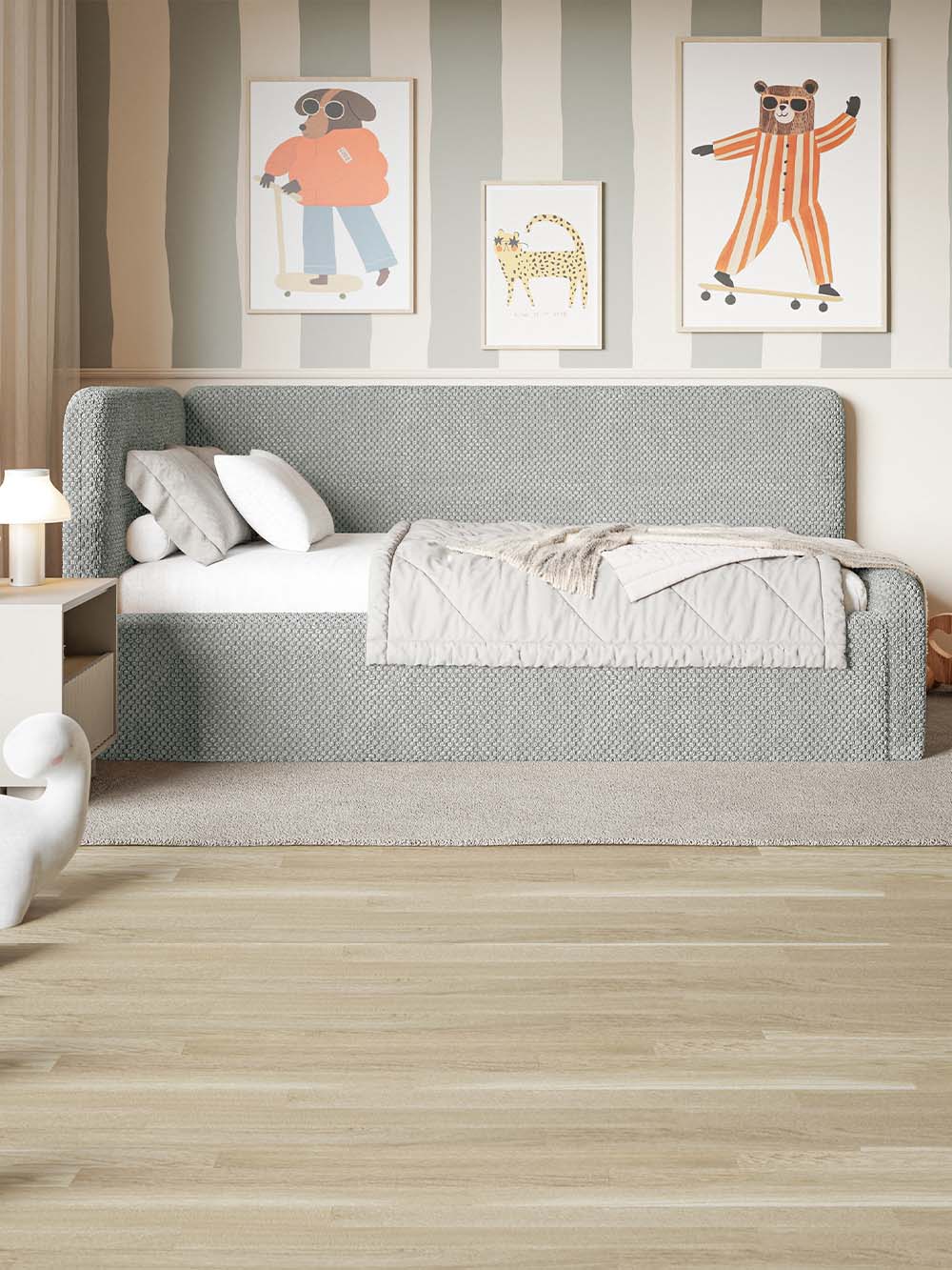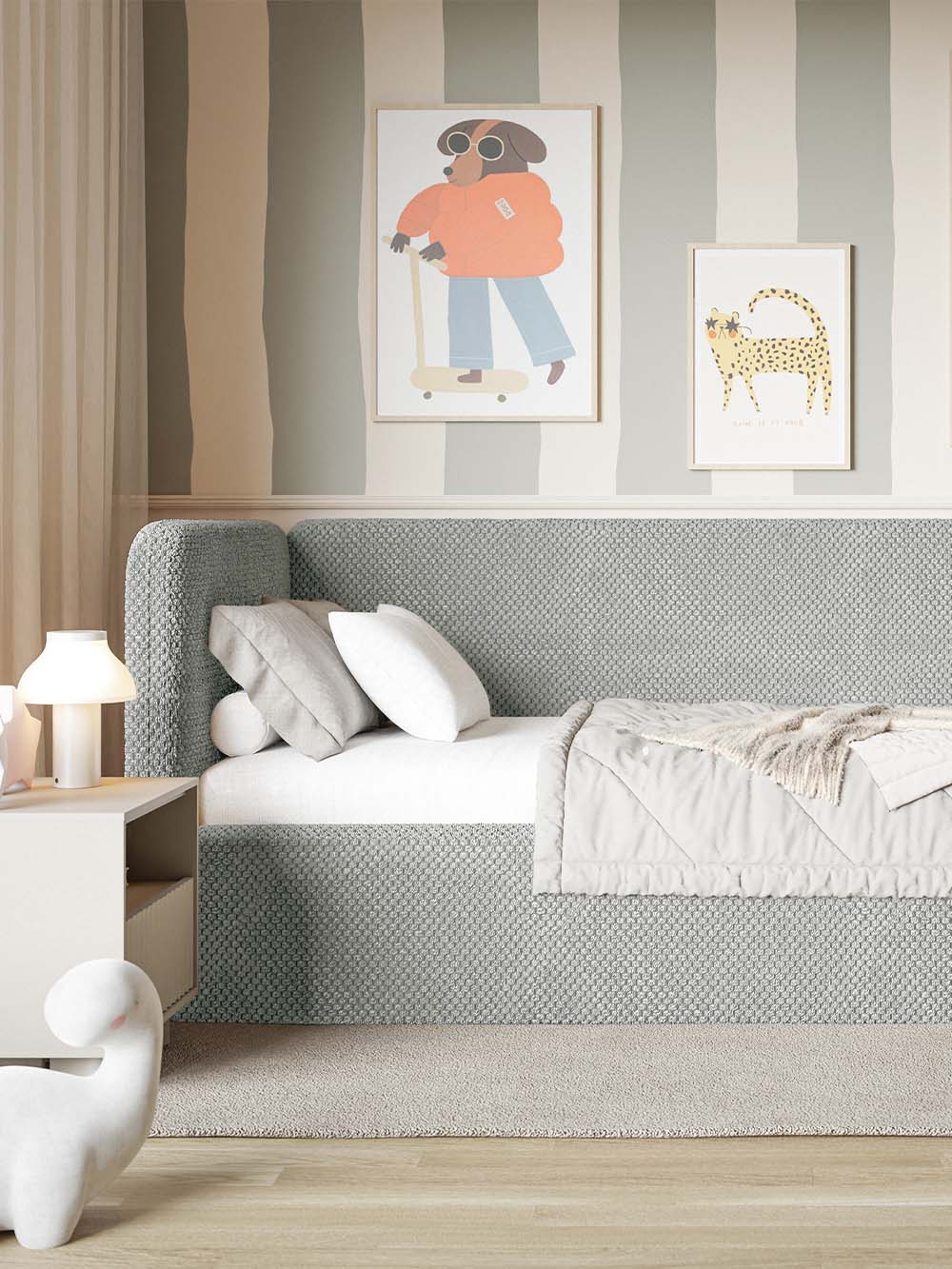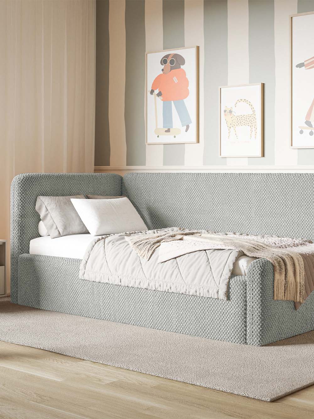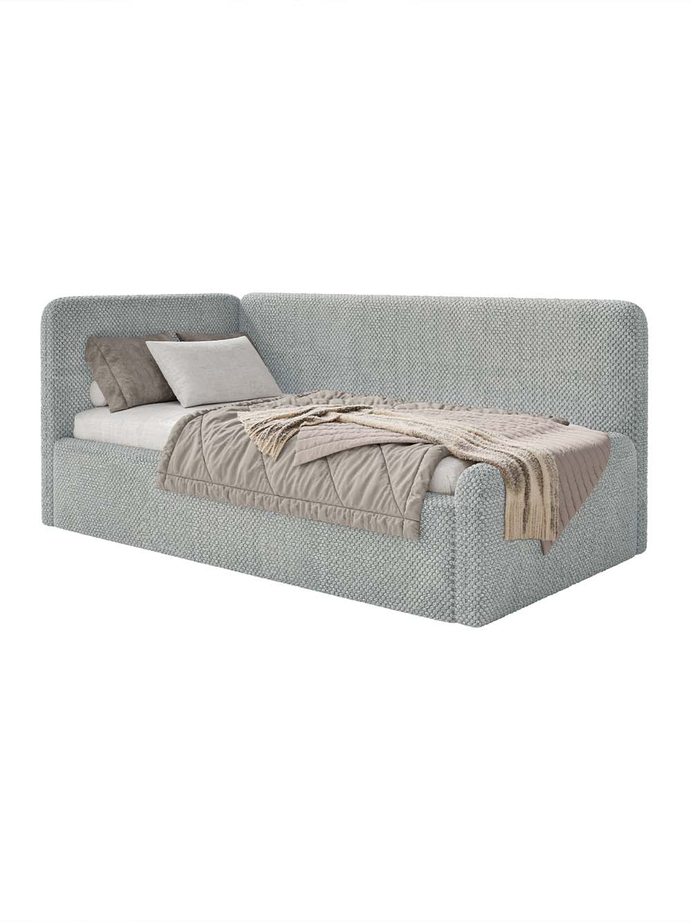 Vaikiška lova Neo – tai modernaus ir funkcionalaus dizaino baldas, sukurtas patogiam kasdieniam vaikų ir paauglių poilsiui bei miegui. Švelnios formos ir minkšta konstrukcija suteikia komfortišką atramą ilsintis, skaitant ar leidžiant laiką lovoje. Lova aptraukta minkštu, itin maloniu liesti pliušiniu audiniu su hidrofobine danga, todėl yra praktiška ir lengvai prižiūrima kasdienio naudojimo metu. Integruota patalynės dėžė suteikia papildomos vietos daiktams ir padeda palaikyti tvarką kambaryje. Plati komplektacijos pasiūla leidžia lengvai pritaikyti lovą individualiems poreikiams ir interjerui.