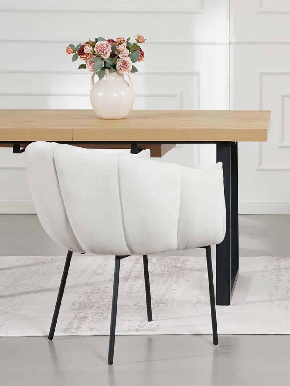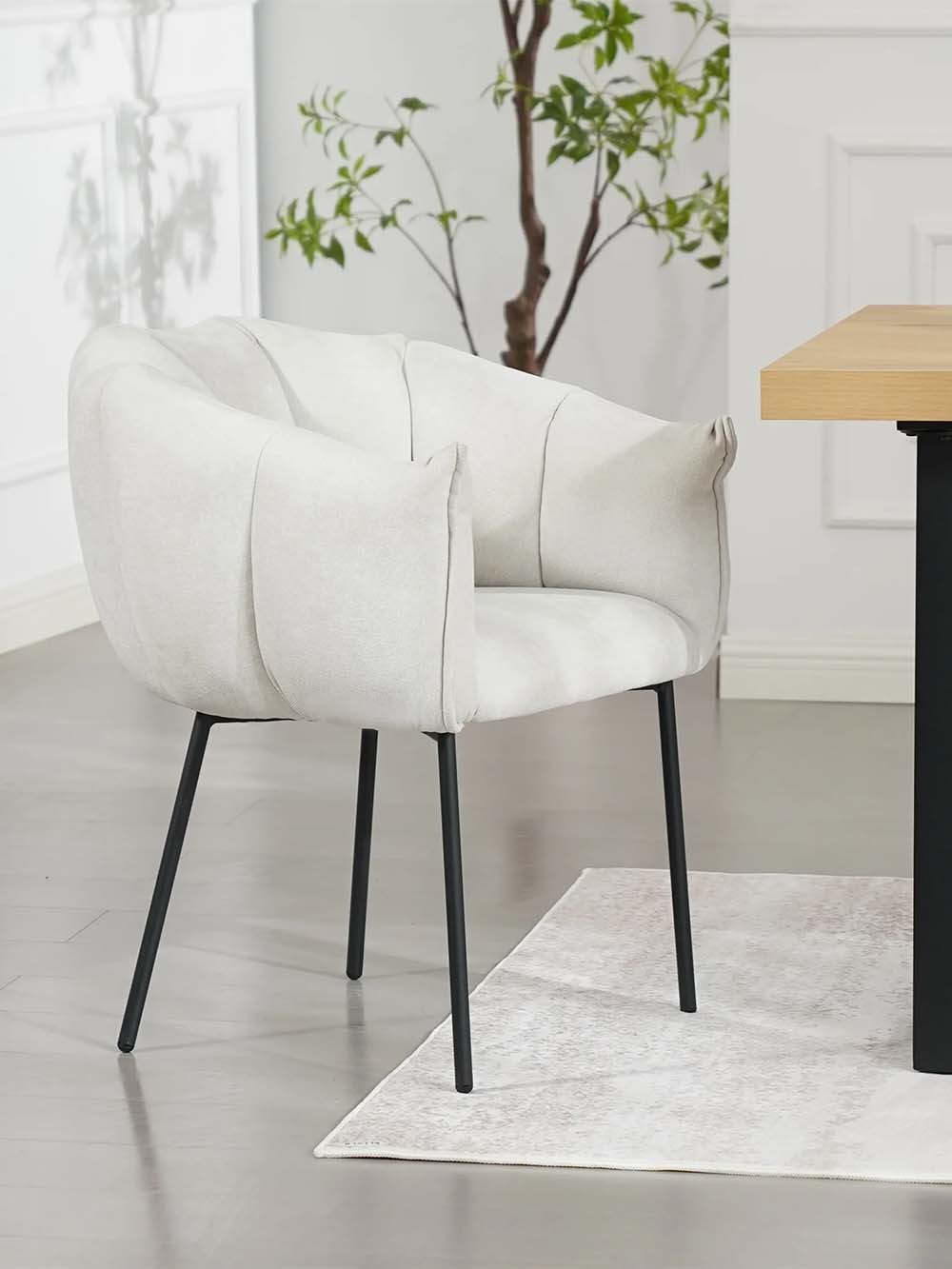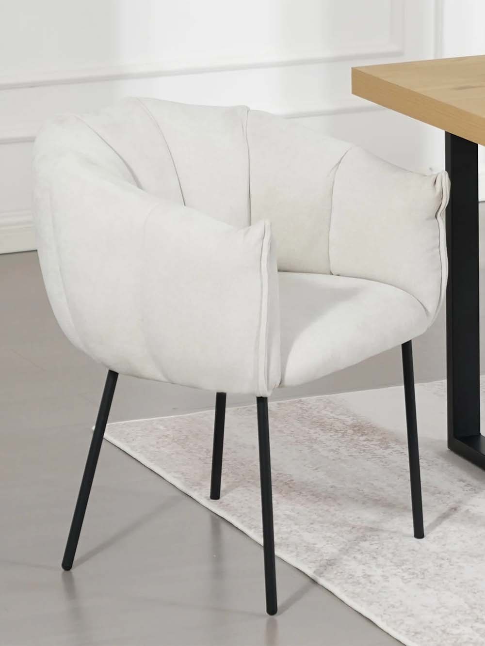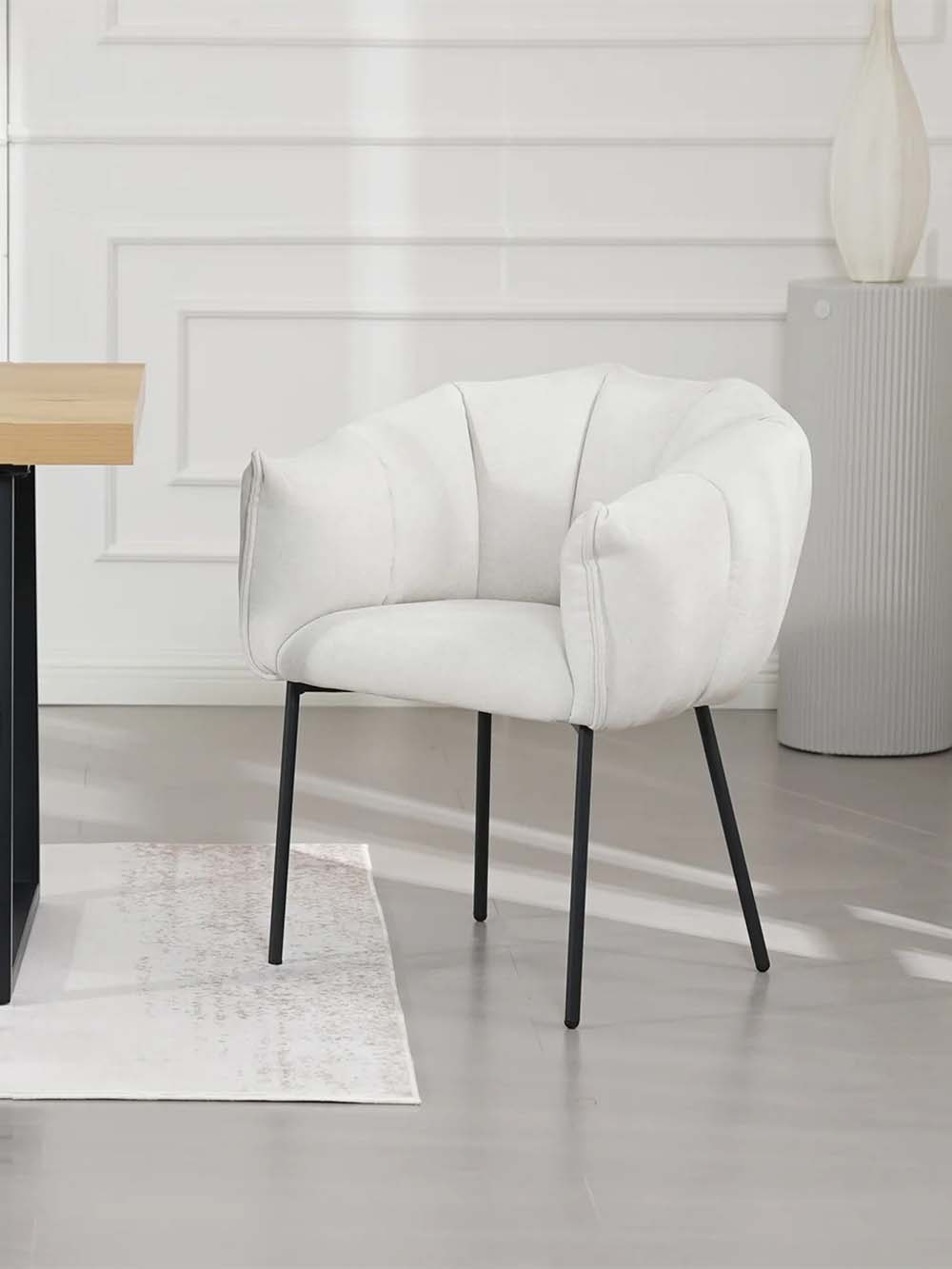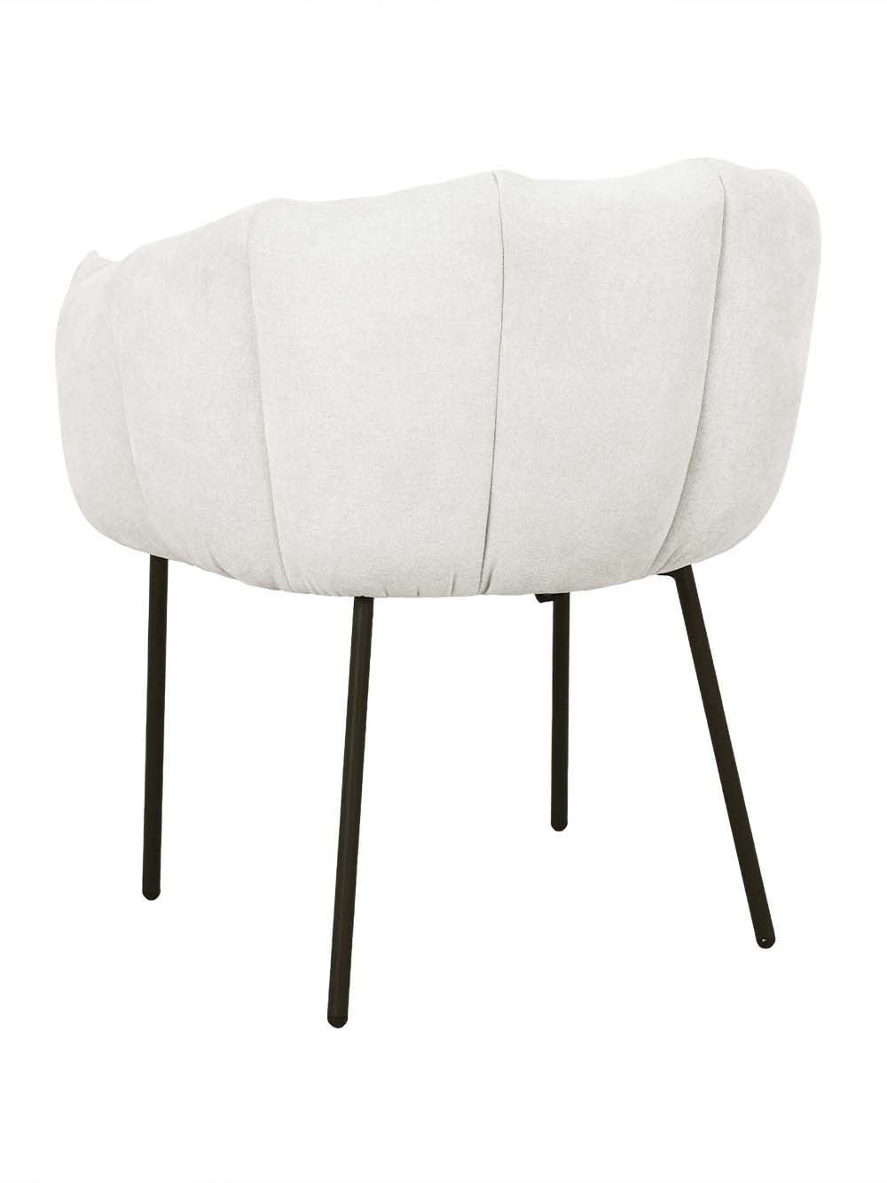 Valgomojo kėdė Arena – stilingas baldas, išsiskiriantis minkštu siluetu ir dekoratyviai segmentuotu atlošu. Kreminės spalvos šenilinis audinys suteikia jaukumo, o juodas plieninis kojų rėmas pabrėžia modernų charakterį. Apgaubiantis atlošas ir minkšta sėdimoji dalis užtikrina komfortą. Puikus pasirinkimas tiek kasdieniams pietums, tiek ilgesniems vakarams prie stalo.