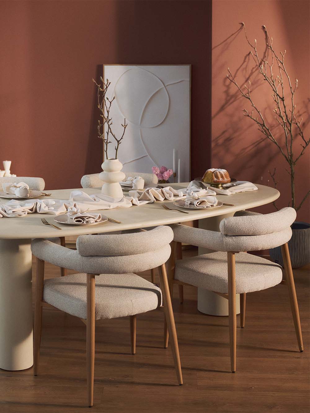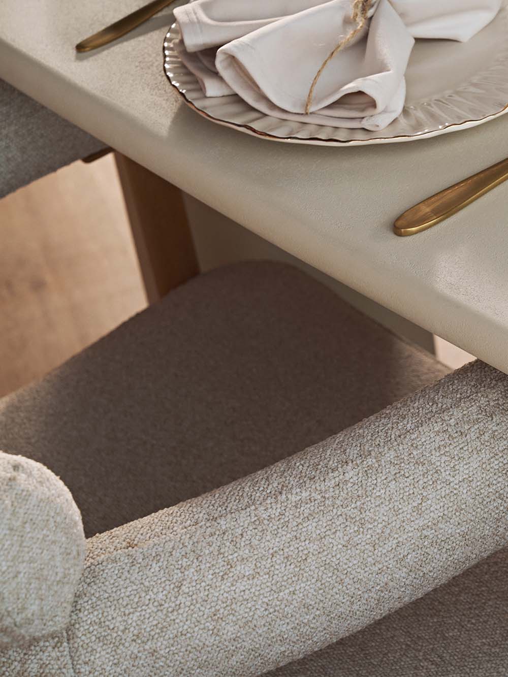 Valgomojo kėdė Loren pasižymi moderniu, švelnių linijų dizainu, kuris interjerui suteikia jaukumo ir subtilios elegancijos. Smėlio spalvos sėdynė ir atlošas harmoningai dera su metaliniu kojų rėmu, dengtu natūralaus ąžuolo atspalvio apdaila, suteikiančia baldui vizualinio lengvumo. Ergonomiškai suformuotas, apgaubiantis atlošas su porankiais ir minkšta sėdimoji dalis užtikrina komfortą patogiam kasdieniam naudojimui.