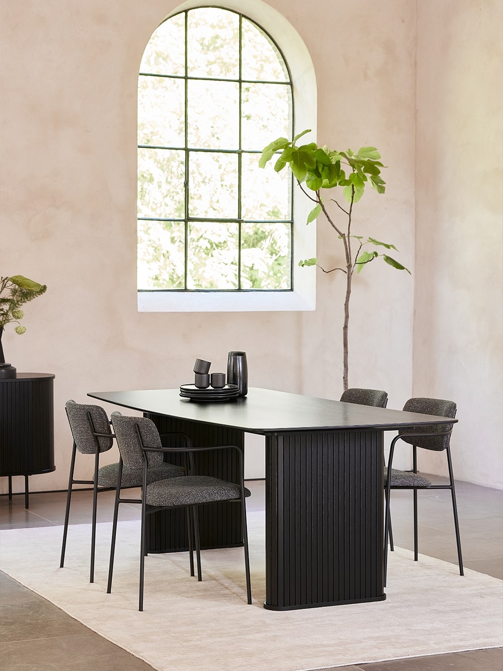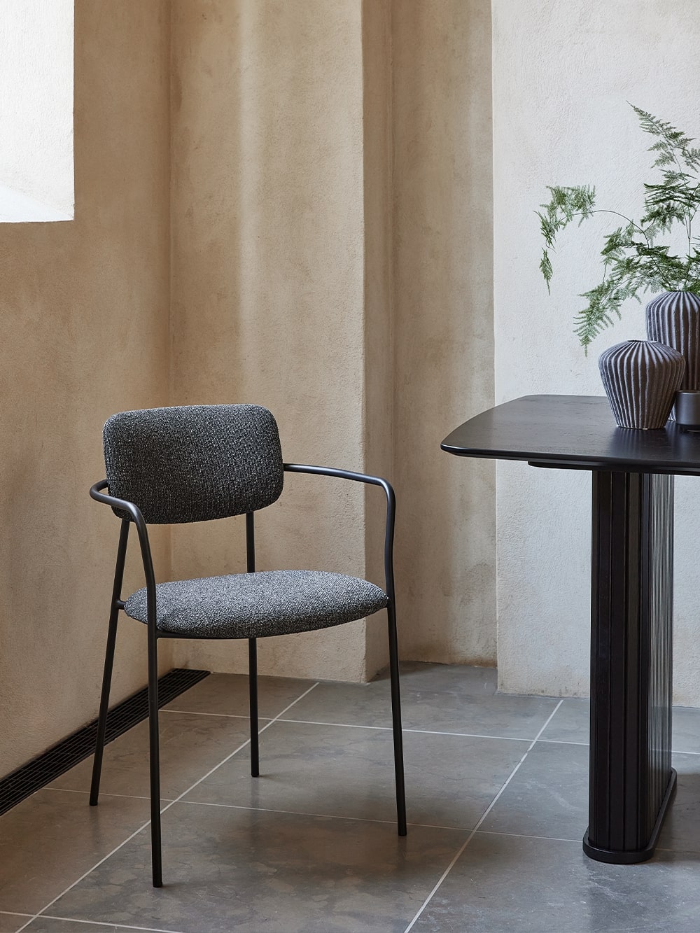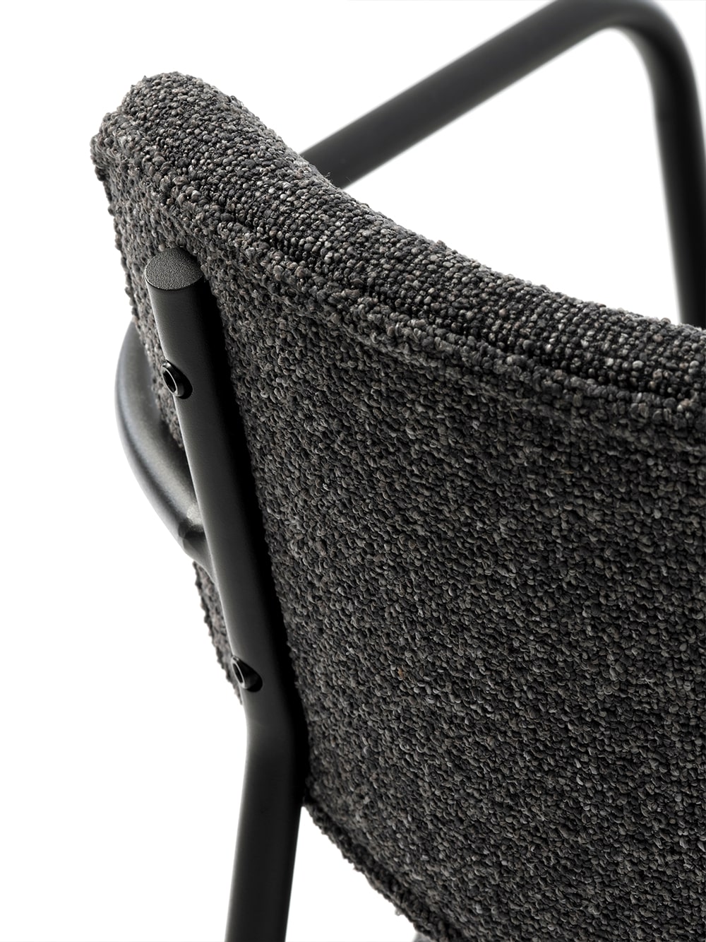 Apie audinį: HEVRE – tai inovatyvus audinys, pagamintas iš dviejų skirtingų verpalų rūšių. Ploni siūlai sukuria tankų, tvirtą pagrindą, o storesni, pūkuoti siūlai suteikia audiniui išskirtinę bouclé faktūrą su subtiliomis kilputėmis. Dėl tokios struktūros audinys yra itin malonus liesti, tvirtas ir atsparesnis užsikabinimams nei įprasti bouclé audiniai. Derinant kelių spalvų pluoštus, sukuriamas subtilus, gylio ir prabangos pojūtį suteikiantis efektas.