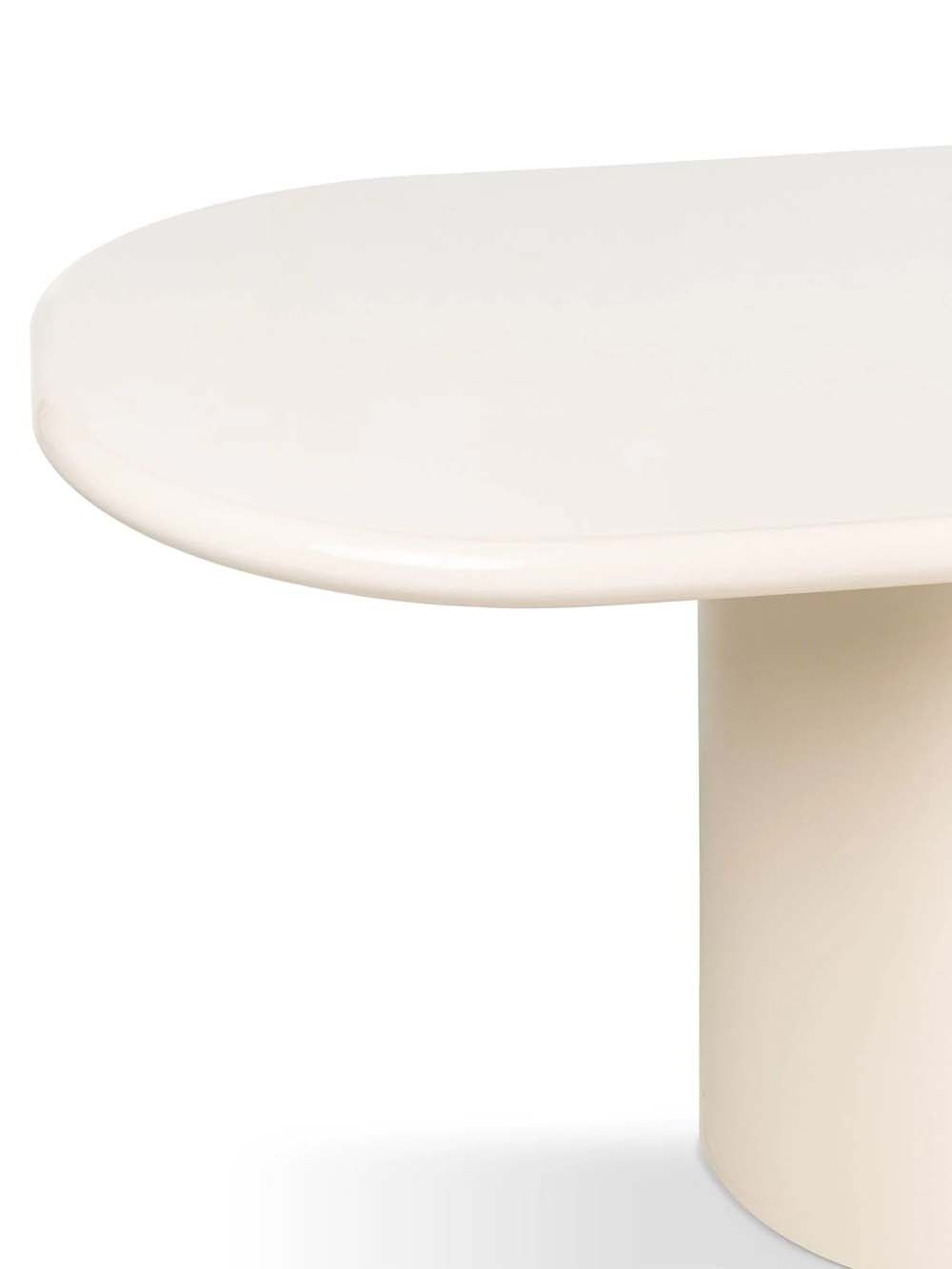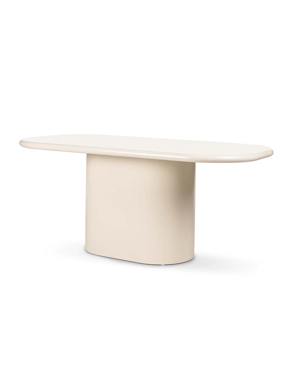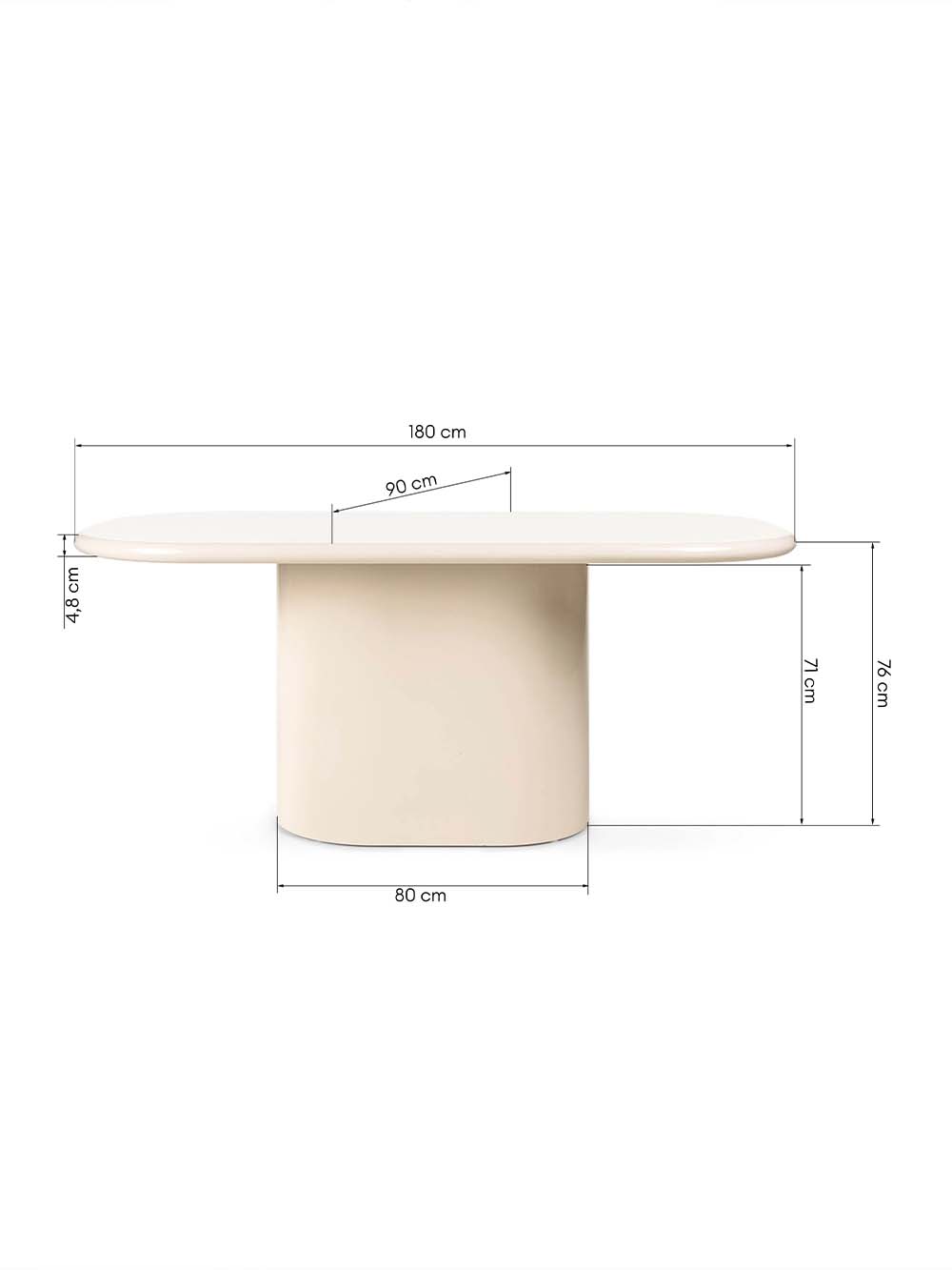 Valgomojo stalas Duvira – modernaus ir elegantiško dizaino baldas, išsiskiriantis švelniomis, apvaliomis formomis. Šviesiai smėlio spalvos paviršius su blizgia apdaila suteikia interjerui šviesumo ir subtilios prabangos. Ovalus stalviršis užtikrina patogią erdvę susėsti, o tvirtas cilindro formos pagrindas garantuoja stabilumą bei vizualinį vientisumą. Puikiai tinka kasdieniams pietums bei jaukiems susibūrimams su šeima ar draugais.