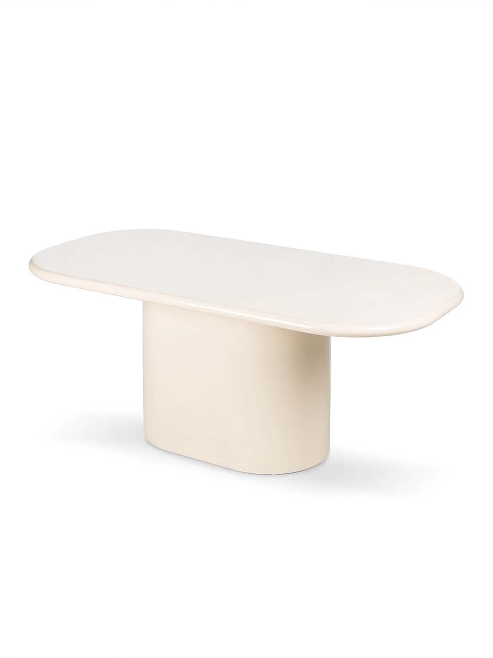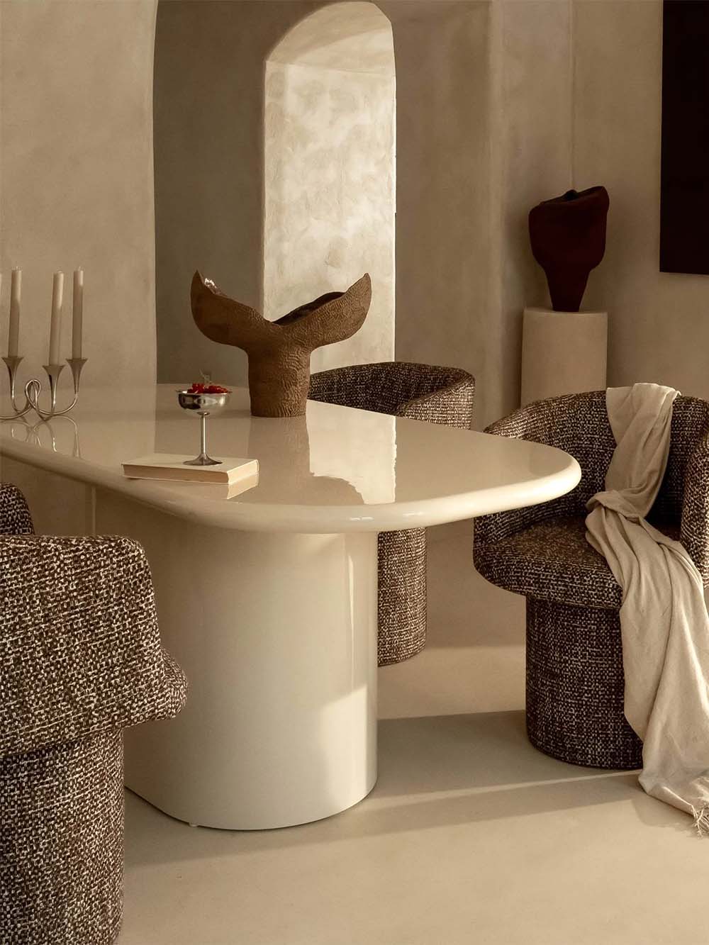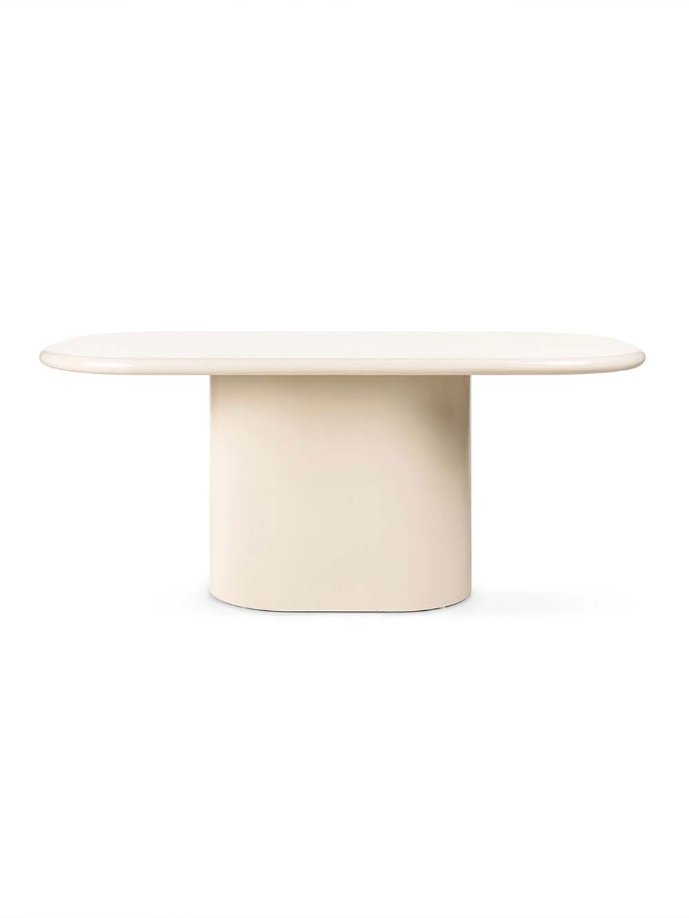 Valgomojo stalas Duvira – modernaus ir elegantiško dizaino baldas, išsiskiriantis švelniomis, apvaliomis formomis. Šviesiai smėlio spalvos paviršius su blizgia apdaila suteikia interjerui šviesumo ir subtilios prabangos. Ovalus stalviršis užtikrina patogią erdvę susėsti, o tvirtas cilindro formos pagrindas garantuoja stabilumą bei vizualinį vientisumą. Puikiai tinka kasdieniams pietums bei jaukiems susibūrimams su šeima ar draugais.