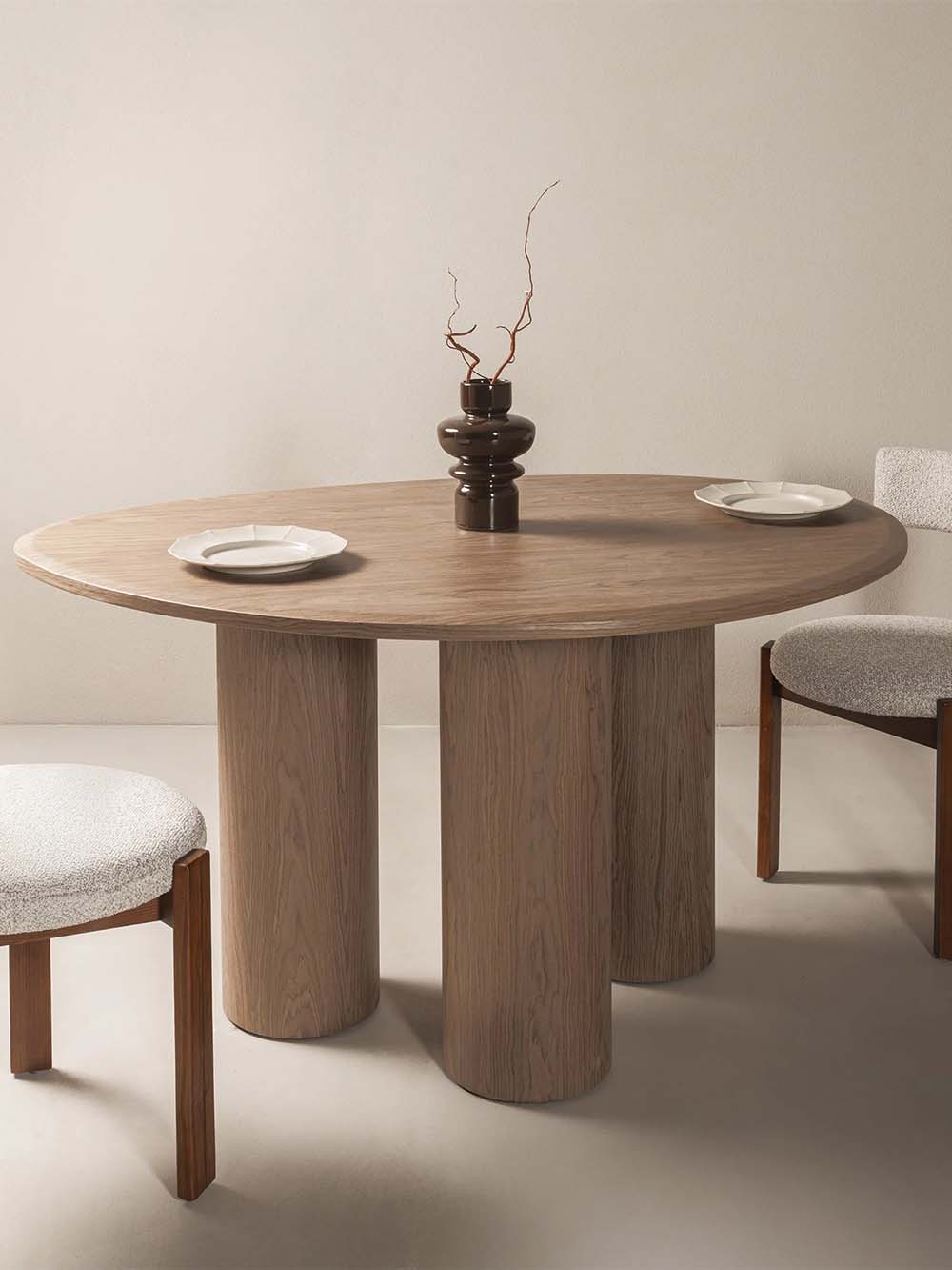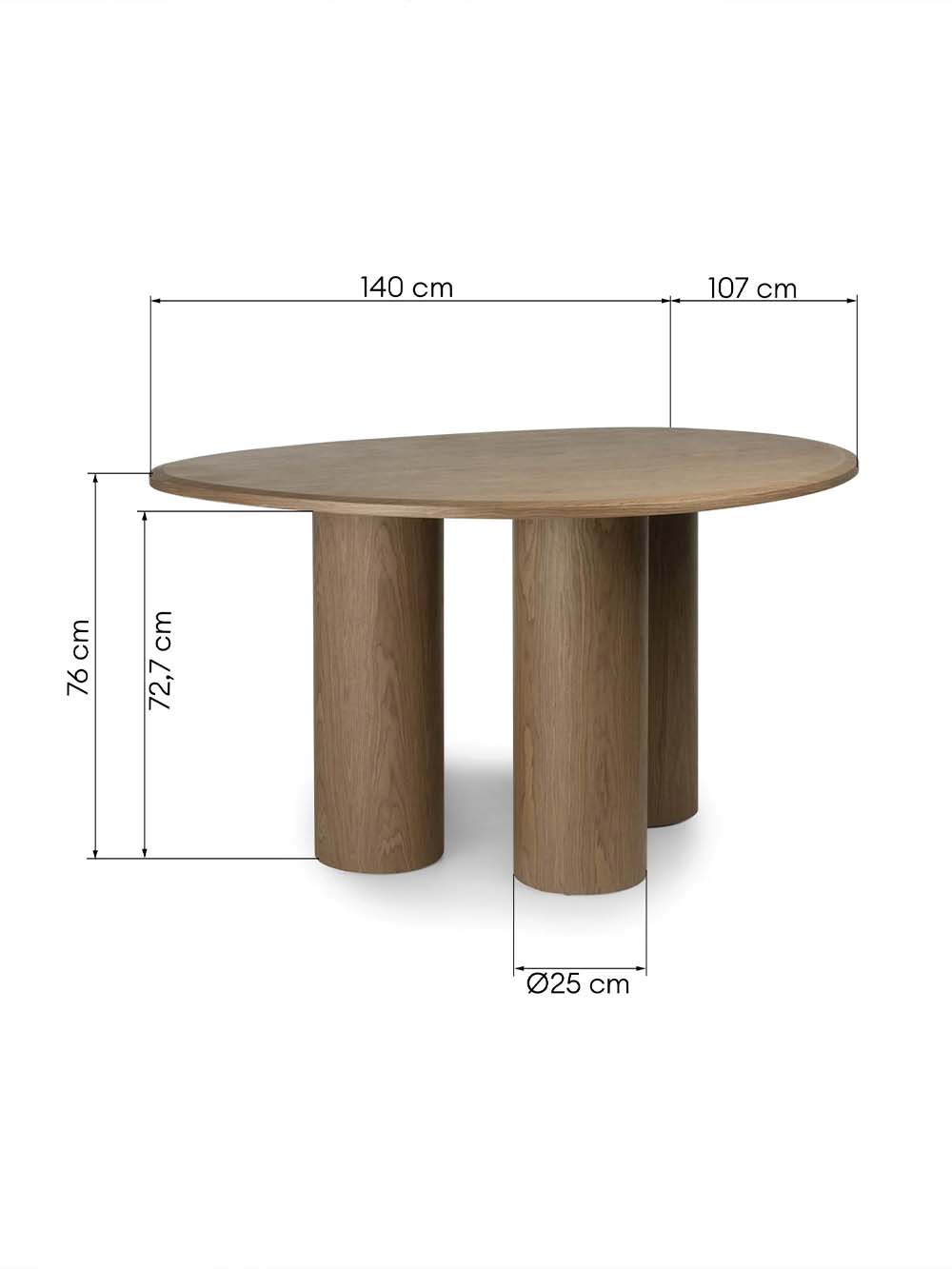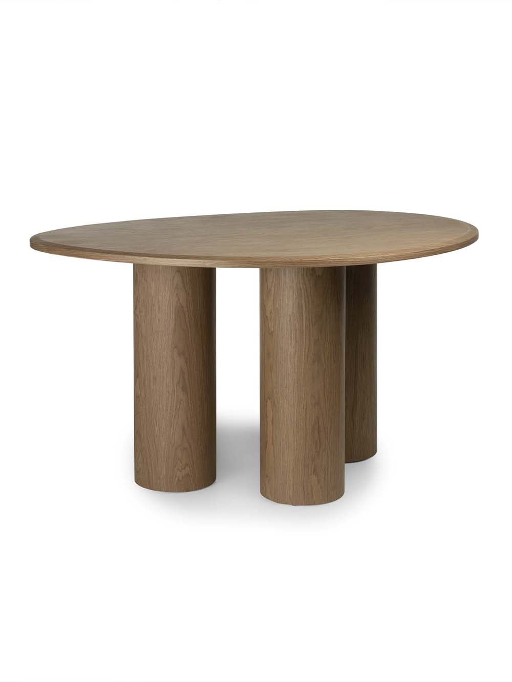 Valgomojo stalas Keren – modernaus dizaino baldas, išsiskiriantis organiška stalviršio forma ir subtilia estetika. Natūrali medienos tekstūra suteikia stalui šilumos ir jaukumo, o trys masyvios, cilindro formos kojos užtikrina stabilumą bei kuria išskirtinį vizualinį akcentą. Patogaus dydžio stalviršis leidžia patogiai susėsti visai šeimai, o tvirta konstrukcija garantuoja komfortišką kasdienį naudojimą. Stalas siūlomas kelių spalvų variantais, todėl lengvai priderinamas prie įvairių interjerų.