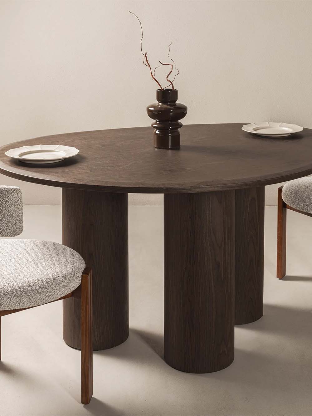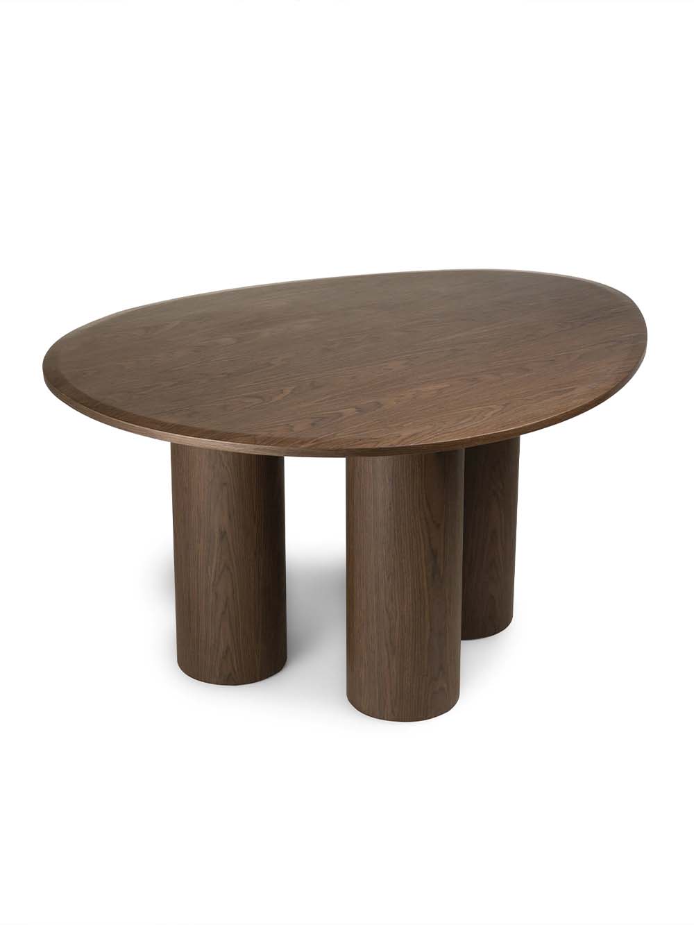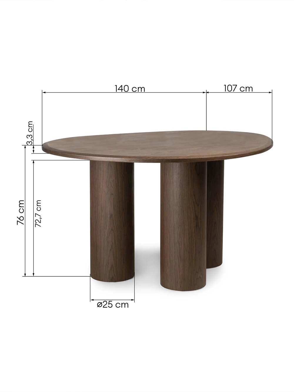 Valgomojo stalas Keren – modernaus dizaino baldas, išsiskiriantis organiška stalviršio forma ir subtilia estetika. Natūrali medienos tekstūra suteikia stalui šilumos ir jaukumo, o trys masyvios, cilindro formos kojos užtikrina stabilumą bei kuria išskirtinį vizualinį akcentą. Patogaus dydžio stalviršis leidžia patogiai susėsti visai šeimai, o tvirta konstrukcija garantuoja komfortišką kasdienį naudojimą. Stalas siūlomas kelių spalvų variantais, todėl lengvai priderinamas prie įvairių interjerų.