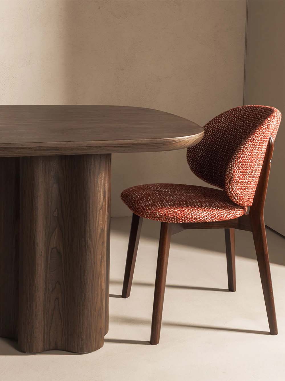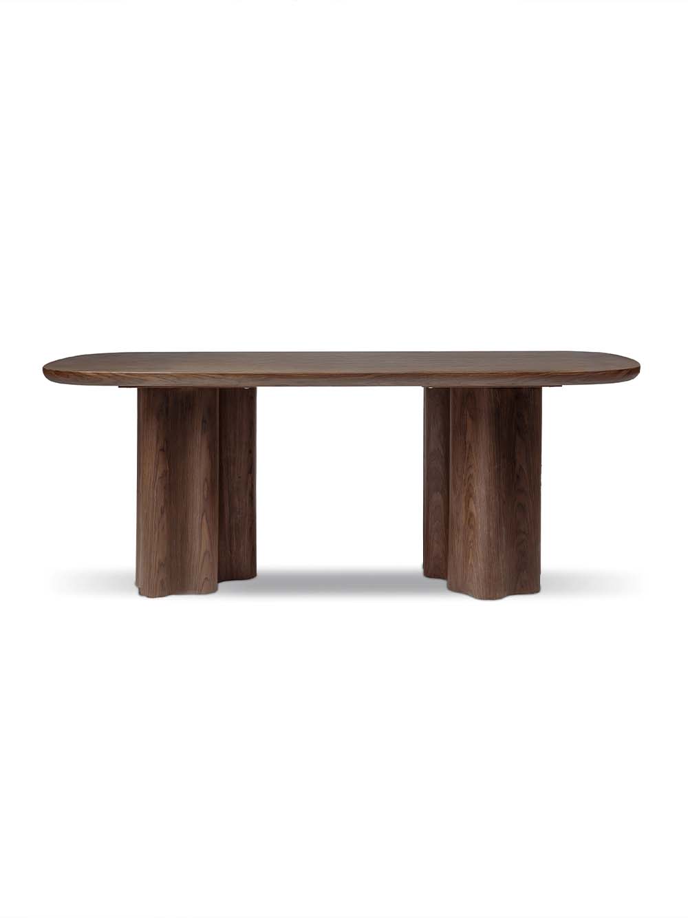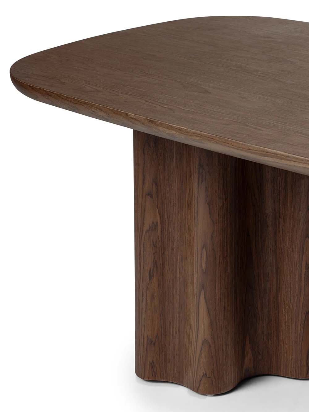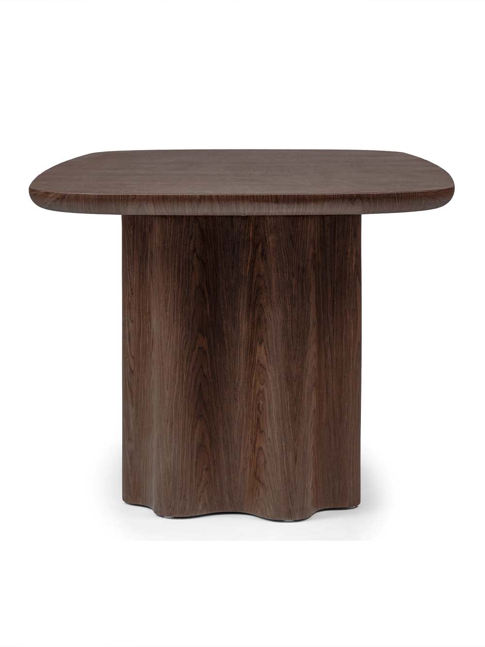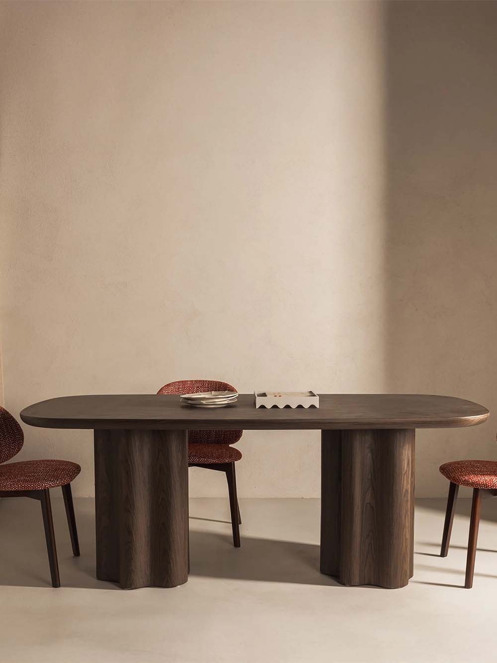 Valgomojo stalas Lunor – išskirtinio dizaino baldas, pasižymintis švelniai apvalintomis formomis ir solidžia estetika. Tamsaus riešuto spalvos apdaila su natūralia medienos tekstūra suteikia stalui šilumos ir vientisumo, o masyvios, skulptūriškos formos kojos užtikrina stabilumą ir tampa pagrindiniu dizaino akcentu. Erdvus stalviršis leidžia patogiai susėsti visai šeimai, o tvirta konstrukcija garantuoja komfortišką kasdienį naudojimą.