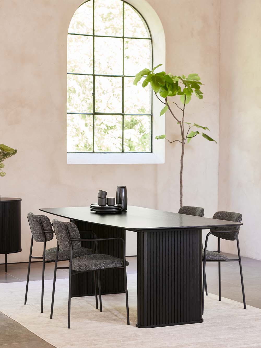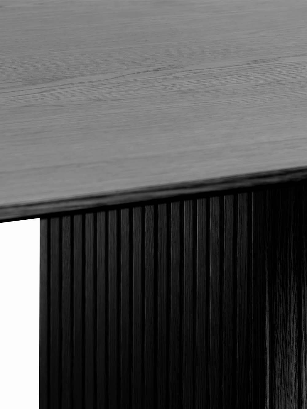 Baldų kolekcija Nala – tai šiuolaikiškų formų ir švelnių linijų derinys, kuriantis lengvą, harmoningą estetiką. Kolekciją išskiria apvalintos formos ir vertikalių linijų faktūra, suteikianti baldams subtilaus dinamiškumo. Natūraliu ąžuolo lukštu faneruota konstrukcija ir matiniai paviršiai užtikrina tvirtumą bei ilgaamžišką išvaizdą. Nala puikiai tinka moderniam, skandinaviškam ar minimalistiniam interjerui – valgomojo, svetainės ar darbo erdvėms.