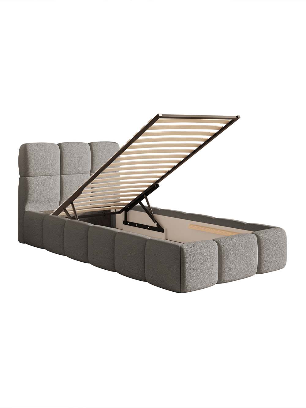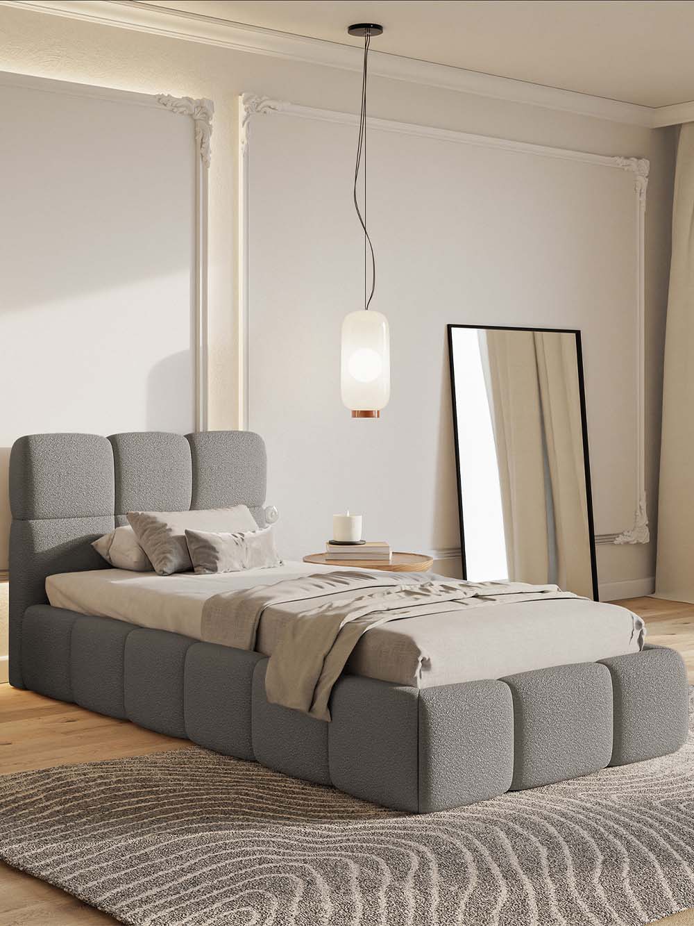 Viengulė lova Capri – šiuolaikiško dizaino baldas, išsiskiriantis minkštomis, iškilių pagalvėlių formos sienelėmis, kurios suteikia interjerui jaukumo ir komforto. Minkštas galvūgalis patogus tiek poilsiui, tiek skaitymui. Lova komplektuojama su metaliniu grotelių rėmu, talpia patalynės dėže ir dujinio pakėlimo mechanizmu, kuris leidžia lengvai ir saugiai pasiekti daiktų laikymo vietą. Galimybė pasirinkti audinį ir jo spalvą leidžia lovą priderinti prie įvairių interjero stilių.